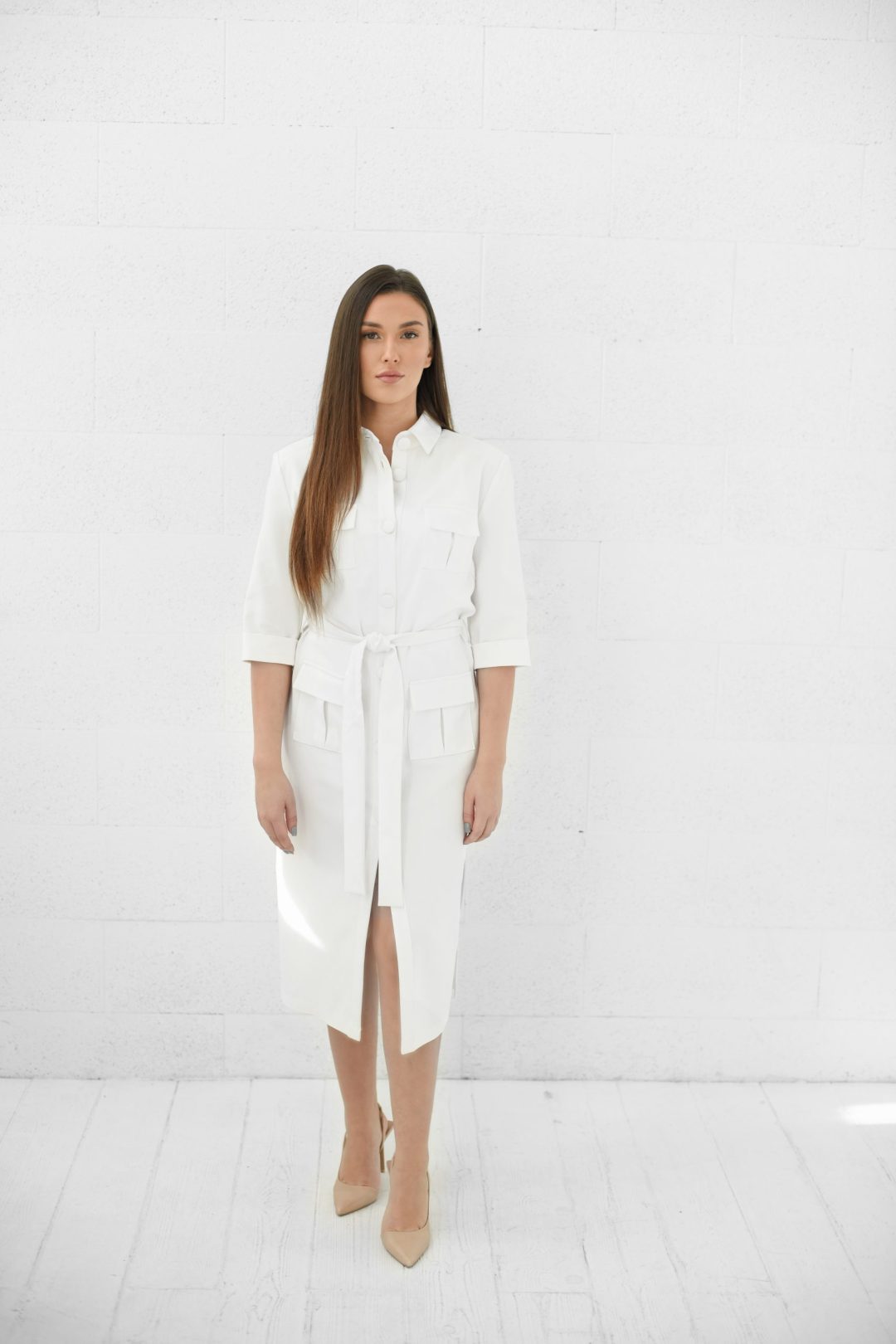 Ana švarkas su sagomis ir kišenėmis, sujuosiamas diržu per juosmenį, ilgomis rankovėmis.