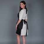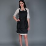 Universal size, black color apron made of impregnated, waterproof fabric. With patch pockets on the front under the ruffles.