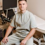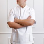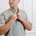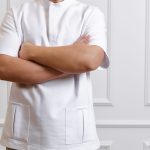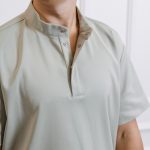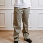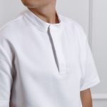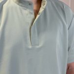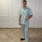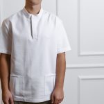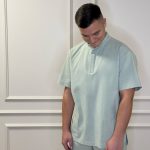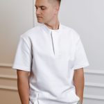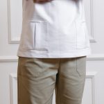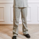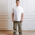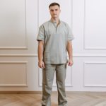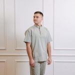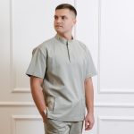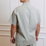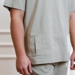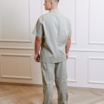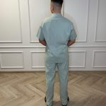 Short-sleeved shirt with pockets, snaps, and straight-cut pants with a drawstring and pockets set.
