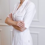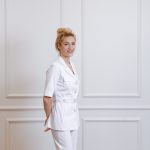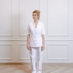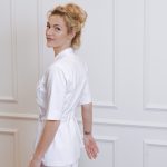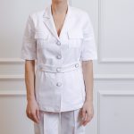 A jacket with buttons and pockets, a buttoned belt through the waist, sleeves elbow length.