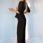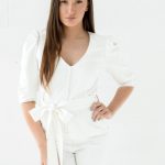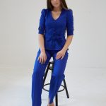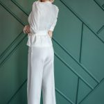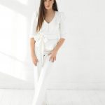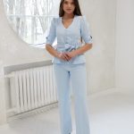 Two pieces set of the top with small buttons, tied through the waist and the wide pants.