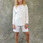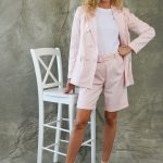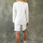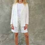 Two pieces set of the wide jacket with buttons and the bermuda shorts with a belt.